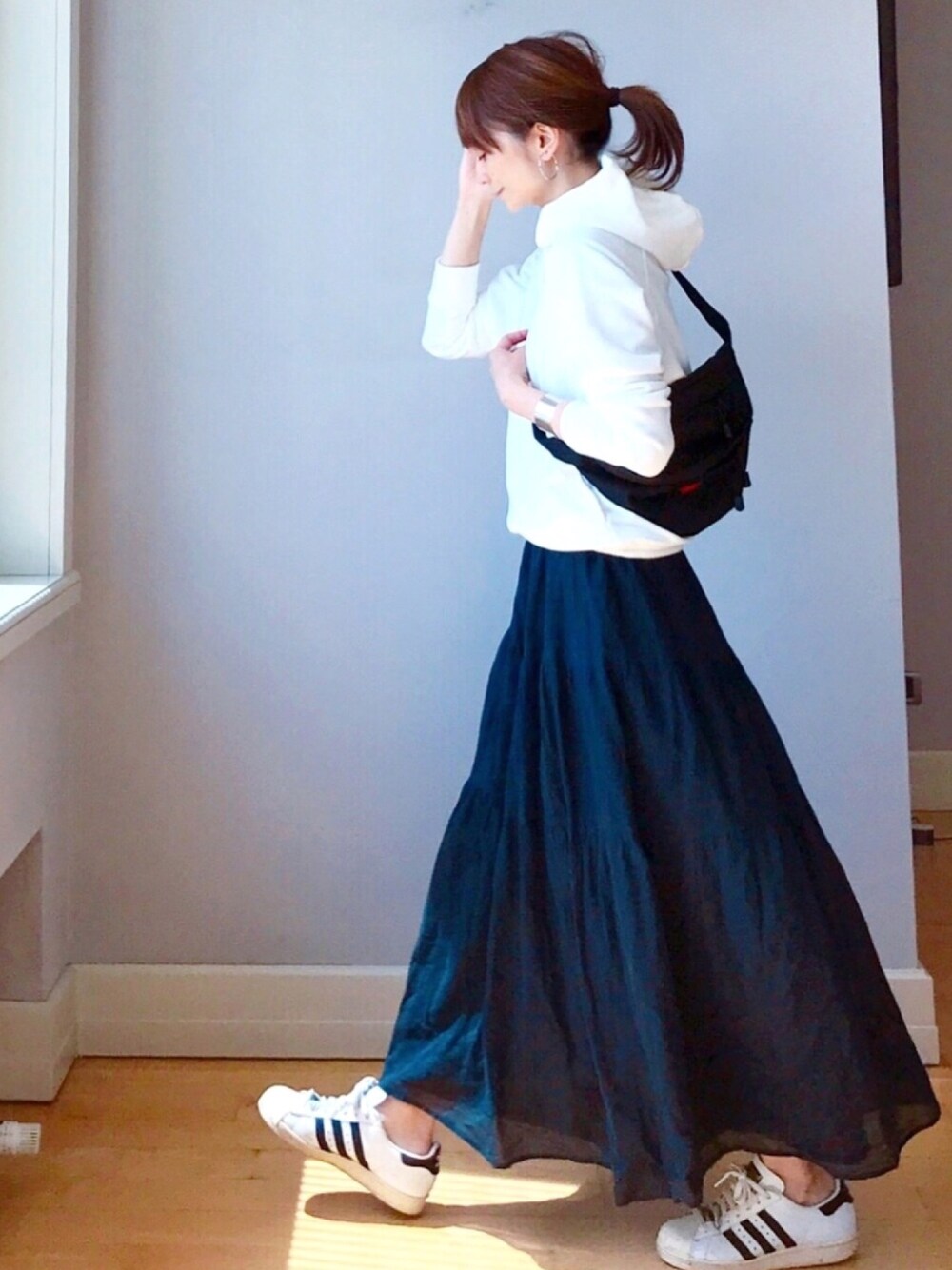 zozo パーカー × ティアードスカート 自分サイズパーカーはスッキリと着れるから、ティアードスカートと合わせるとバランス良いですよ🙆🏻♀️ 令和元年🥺💕💕素晴らしい時代になりますように