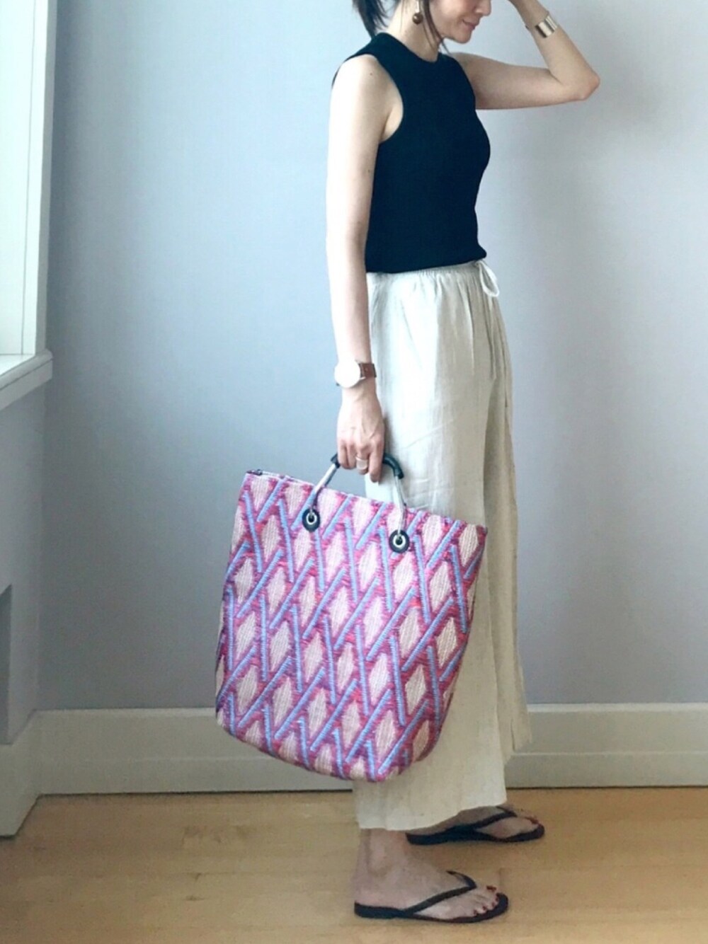夏のシンプルコーデは、柄トートをポイントに🥺💕💕