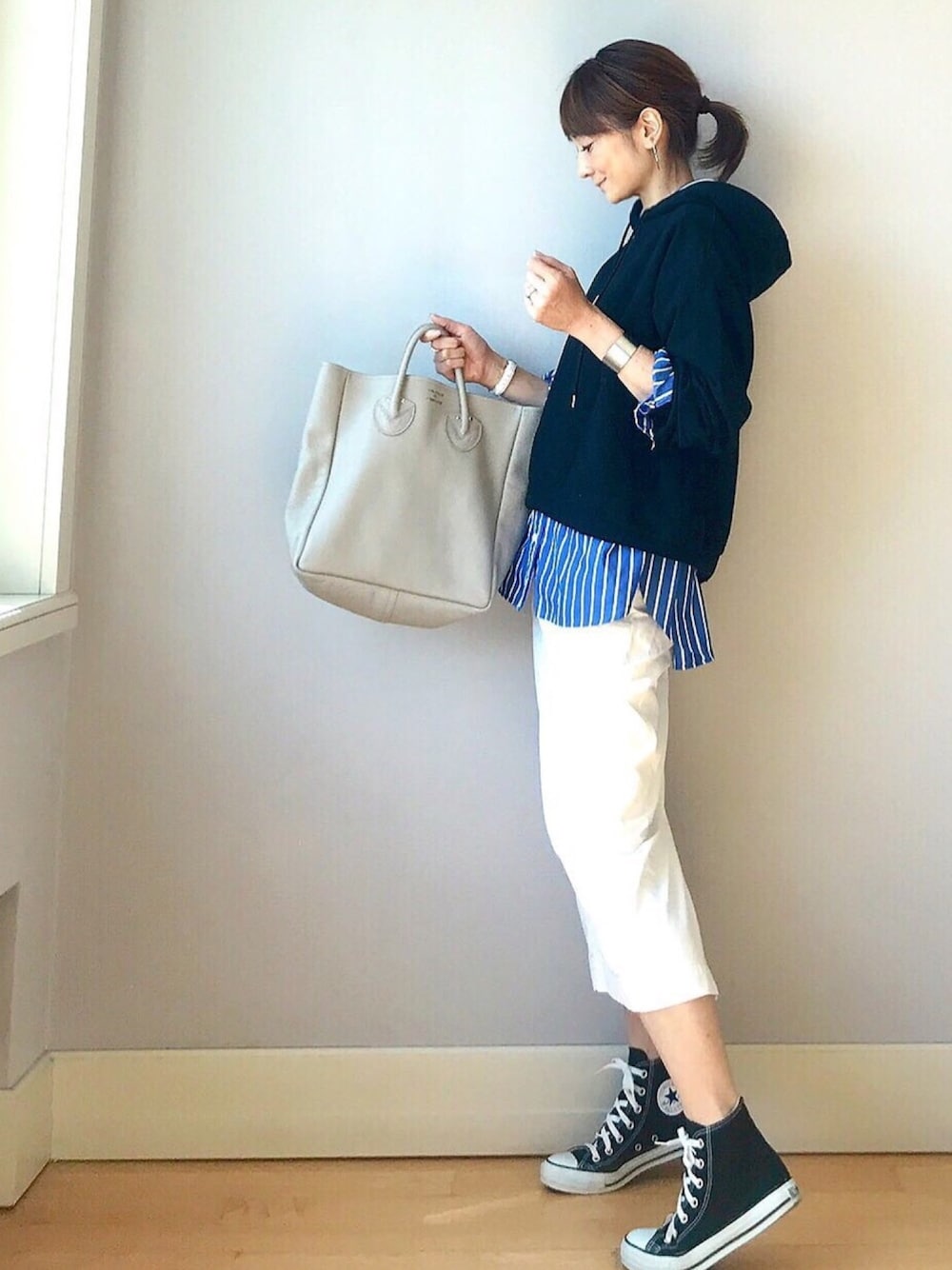 LUMIEのトートバッグ「YOUNG & OLSEN The DRYGOODS STORE/ヤングアンドオルセンザドライグッズストア EMBOSSED LEATHER TOTE M/エン」を使ったコーディネート