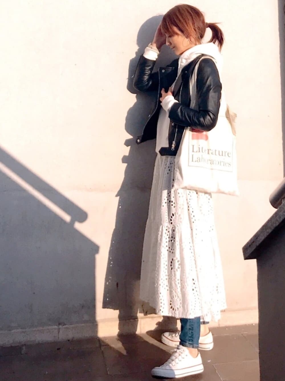 レースワンピ×ライダース 白パーカーを重ねると、バランス良いです。