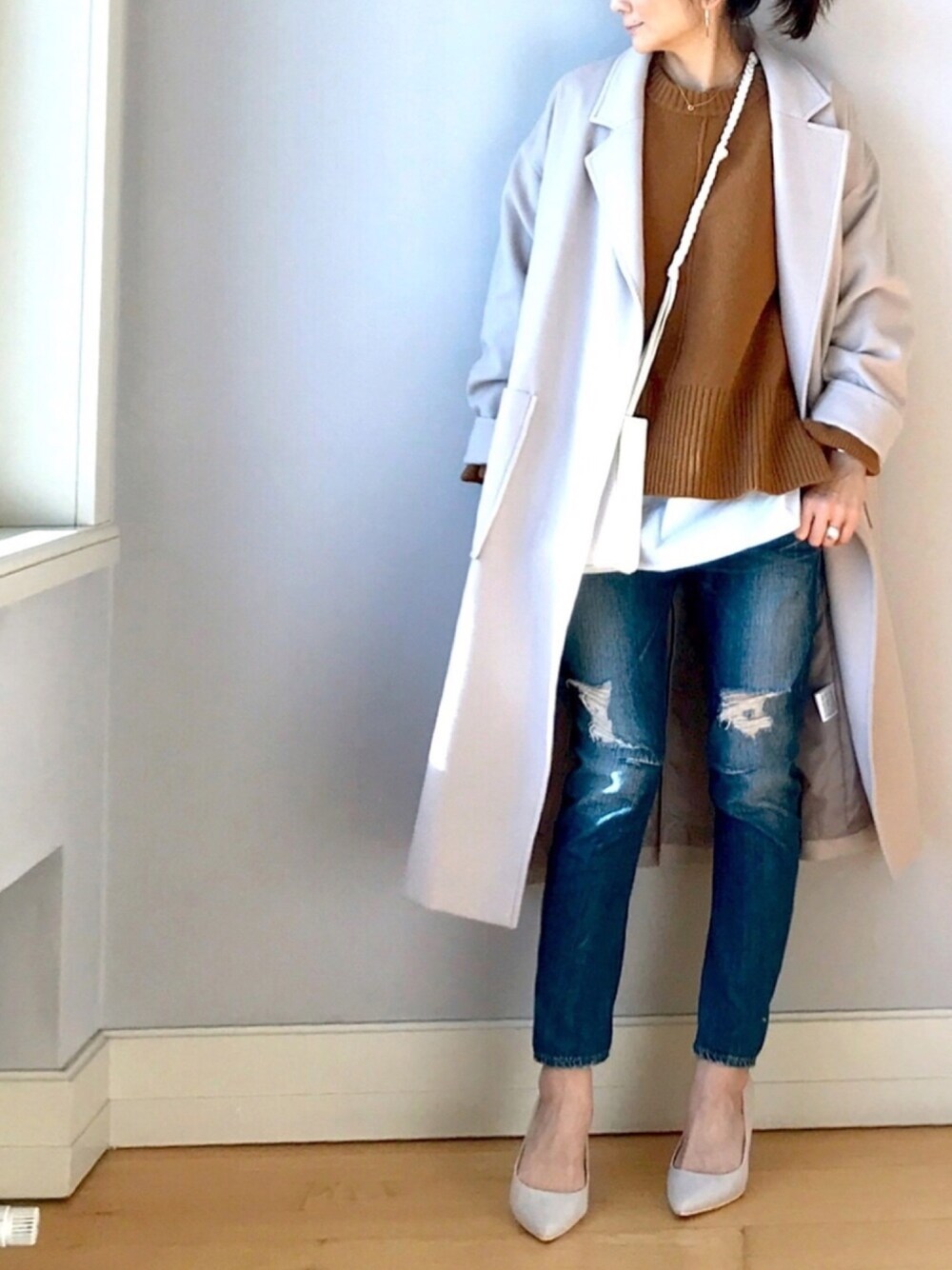 冬のコートスタイル カバンとのバランスを迷う時ありますよね。意外に、コートの中に斜め掛けするとしっくりくることあります。 お試しあれ。