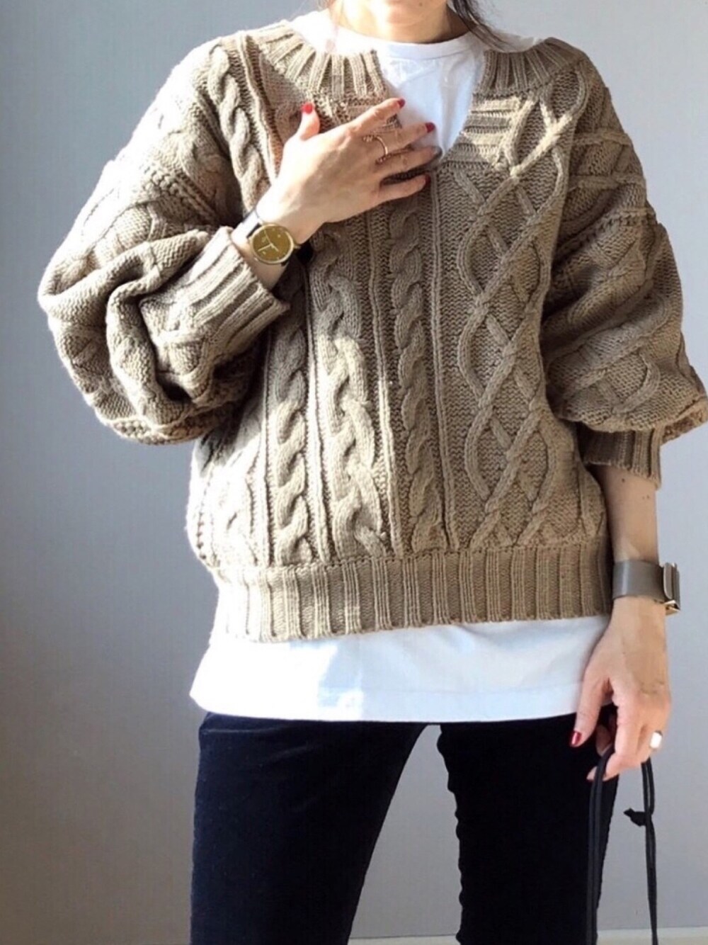 ケーブル編みキーネックニットプルオーバー🧶 中に白Tをレイヤードすると、また印象が変わって新鮮🥺💕💕 ブラウンニットに赤ネイルがマイブーム❤️
