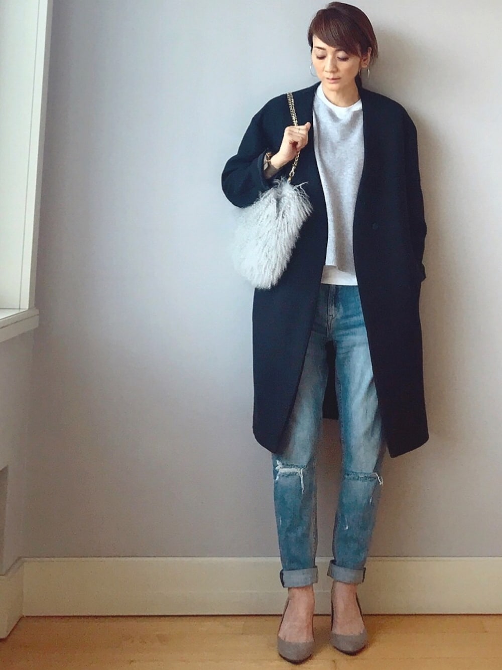 シンプルなノーカラーコートは、着まわし力抜群