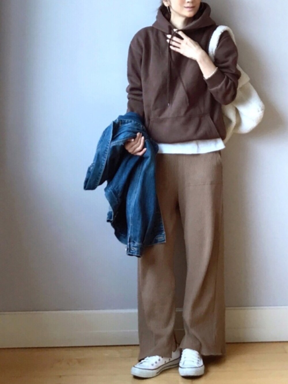 早速 #ブラウン色に染まれ! スポーティなコーデは、ブラウンにすると優しい感じがするから好きです。