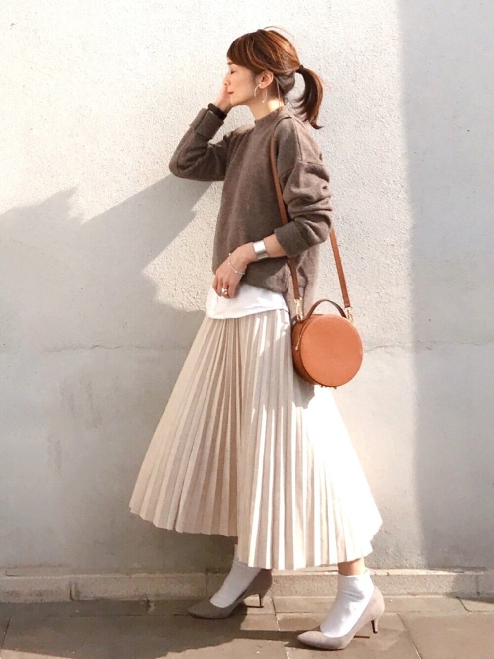 ニット × プリーツスカート プリーツスカート って、フレアより可愛い過ぎず大人でも合わせ易くて好きです🙋🏻♀️‼️ 白靴下で春の予感🌸