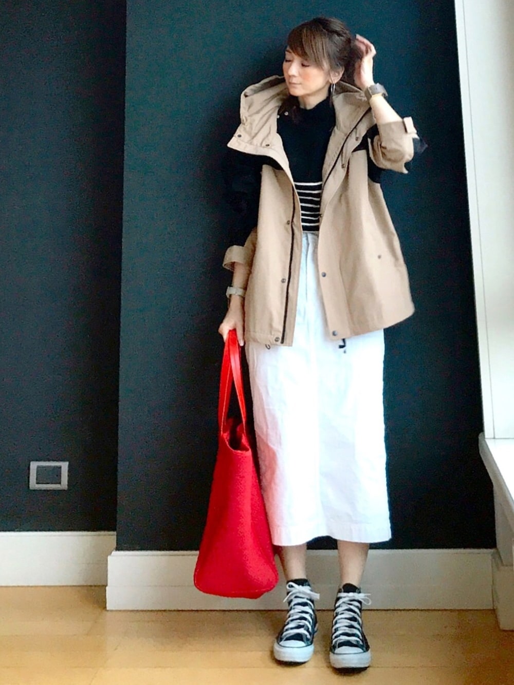 春アウターコーデ シンプルコーデには、赤いトートバックがポイントになります🥺💕💕