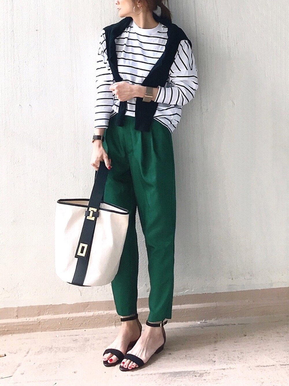 ボーダー × カラーパンツ 肩がけカーディガンで雰囲気を変えて