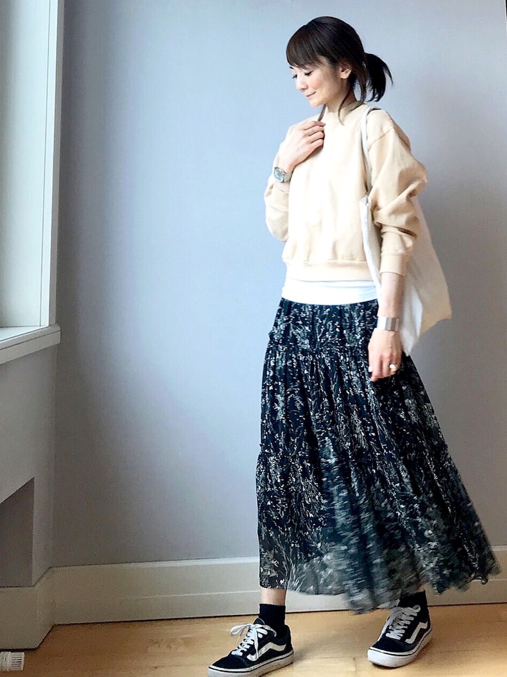 トレーナー ×花柄ワンピース トップスをレイヤードすれば、ワンピースもスカートみたいに着まわせます!凄くお得ですよね。