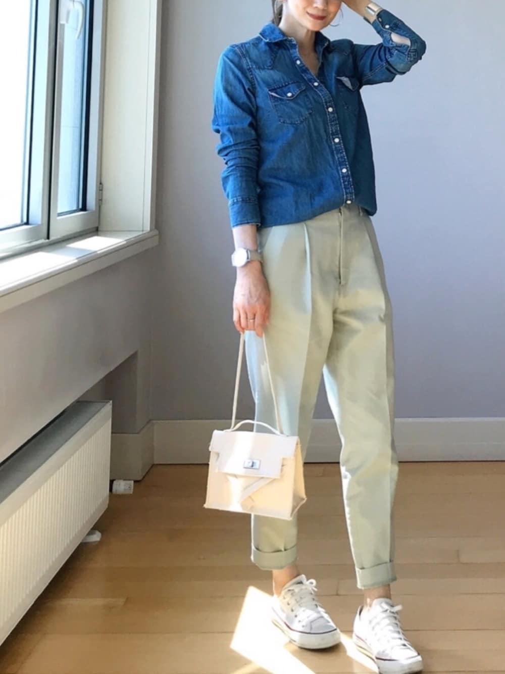 春のデニムシャツにはチノパンを合わせてきましたが、ミントグリーンパンツを合わせたらしっくり🥺💕💕