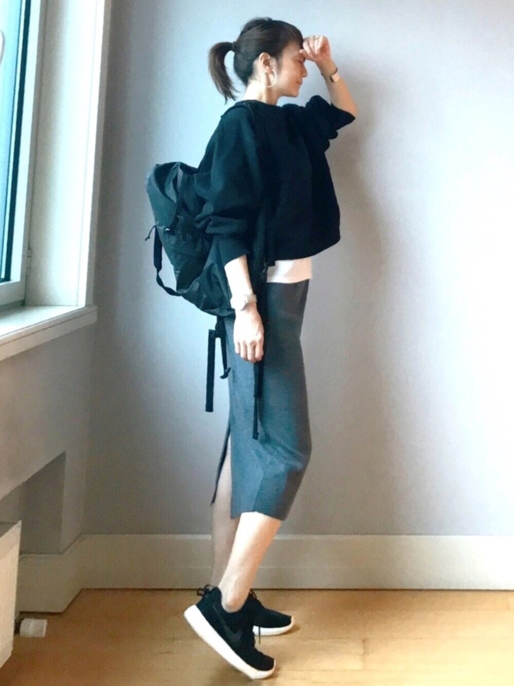 モノトーンカジュアル オールスポーティな中に、一点のタイトスカートで女っぽ