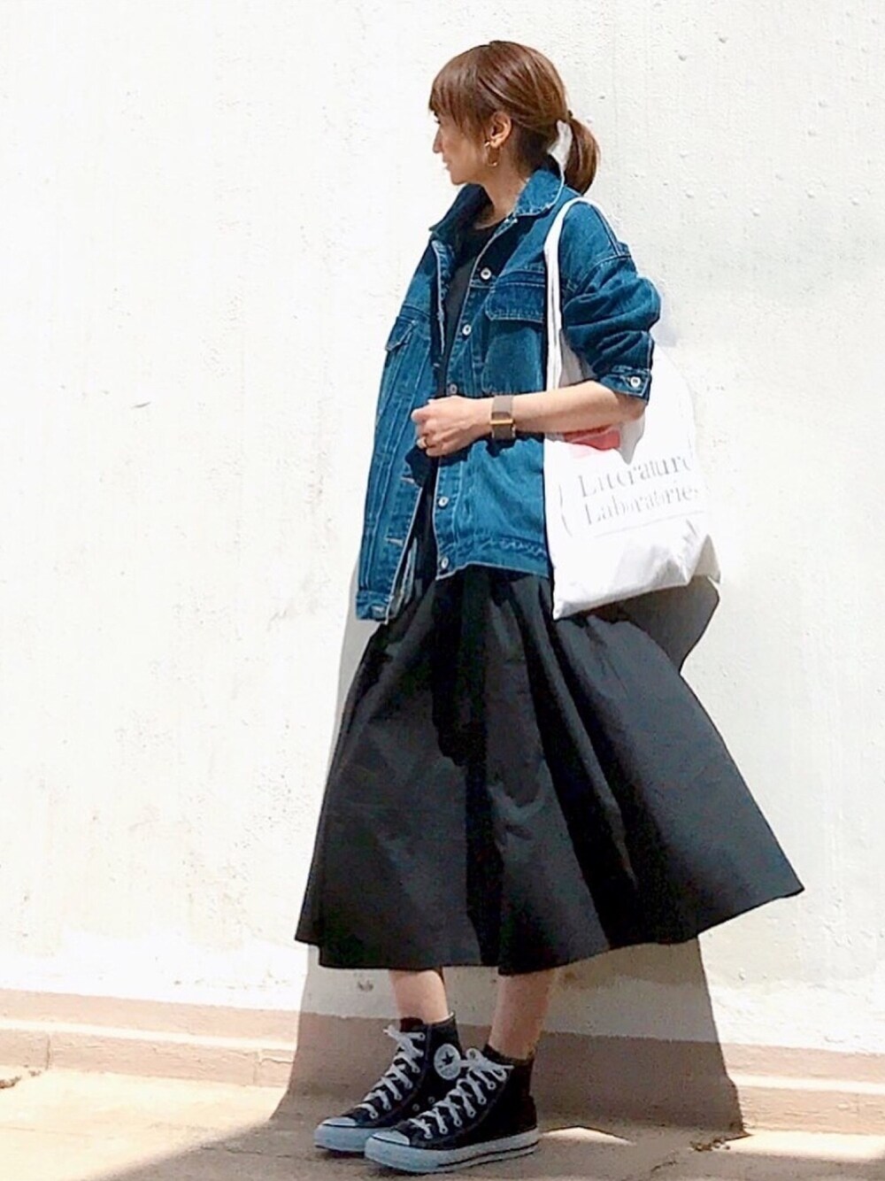 黒ワンピース × デニムジャケット ハイカットスニーカー合わせでちょい辛口に🥺💕💕