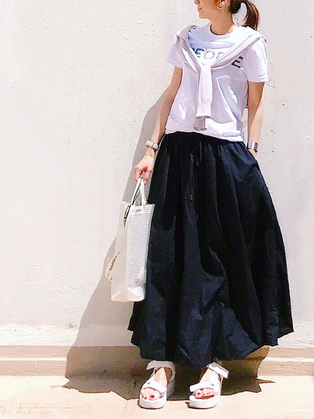 Tシャツ×マキシスカート 肩に掛けたユニクロカーディガンは、白と黒も持ってます🙆🏻♀️こちらのライトグレーの色味、かなり使いやすくてオススメです‼️