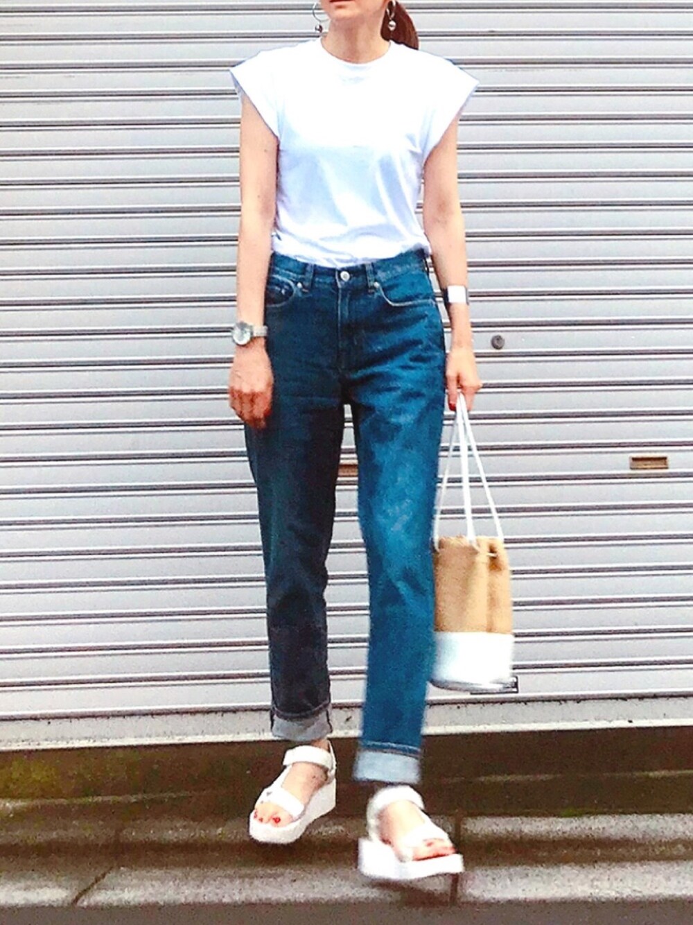 シンプルデニムコーデ Tシャツのフレンチスリーブがポイント🥺💕💕 new in のカゴバックは、白レザーとのコンビが新鮮🙆🏻♀️