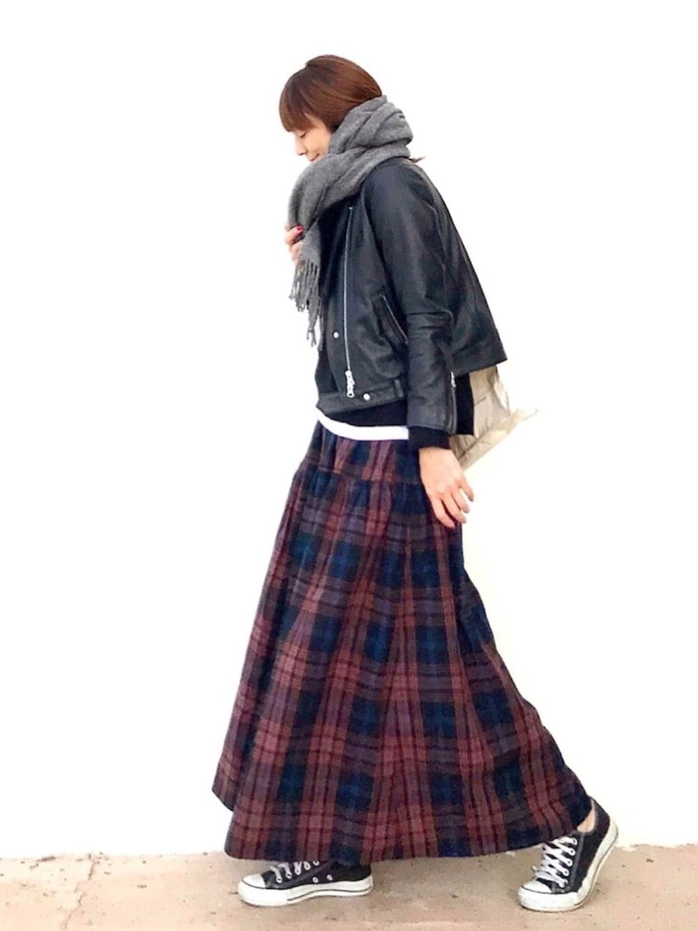 とにかくライダース にはマフラーぐるぐるが好き🧣 早くこれくらい寒くならないかなー🥺💕💕 haco!のチェックスカートもライダース と相性抜群🙆🏻♀️