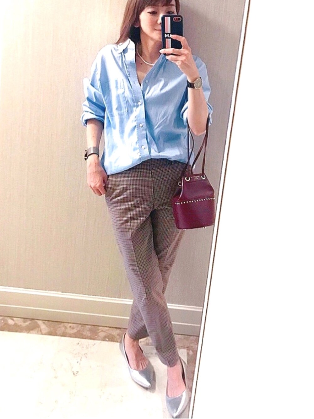 珍しく自撮り🤳 最近この巾着バックをよく持ってます🥺💕💕 ボルドーが秋の差し色にぴったりだし、メンズライクコーデを程よく女らしく見せてくれます🙆🏻♀️ 自撮り映えする携帯カバー詳細はInstagramにて➡︎lumie0206