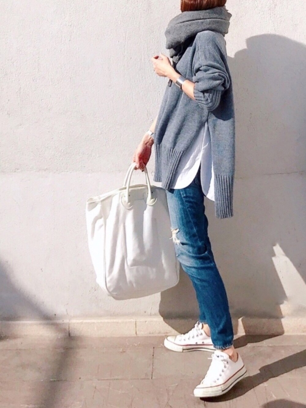 サイドぱっくりなタートルニット🧶 長め丈でも、サイドの開きでバランス取りやすいです🙆🏻♀️ グレー × デニムで淡いワントーンにしてみました🥺💕💕