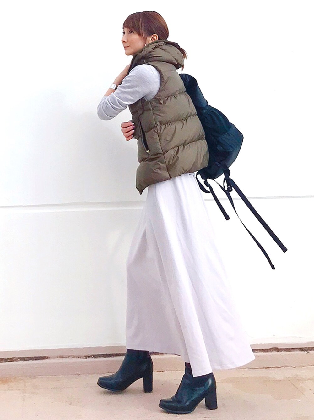 マキシスカート ×ダウンベスト スカートはストンと落ちるシルエットだから、大人カジュアルにぴったり🙆🏻♀️