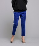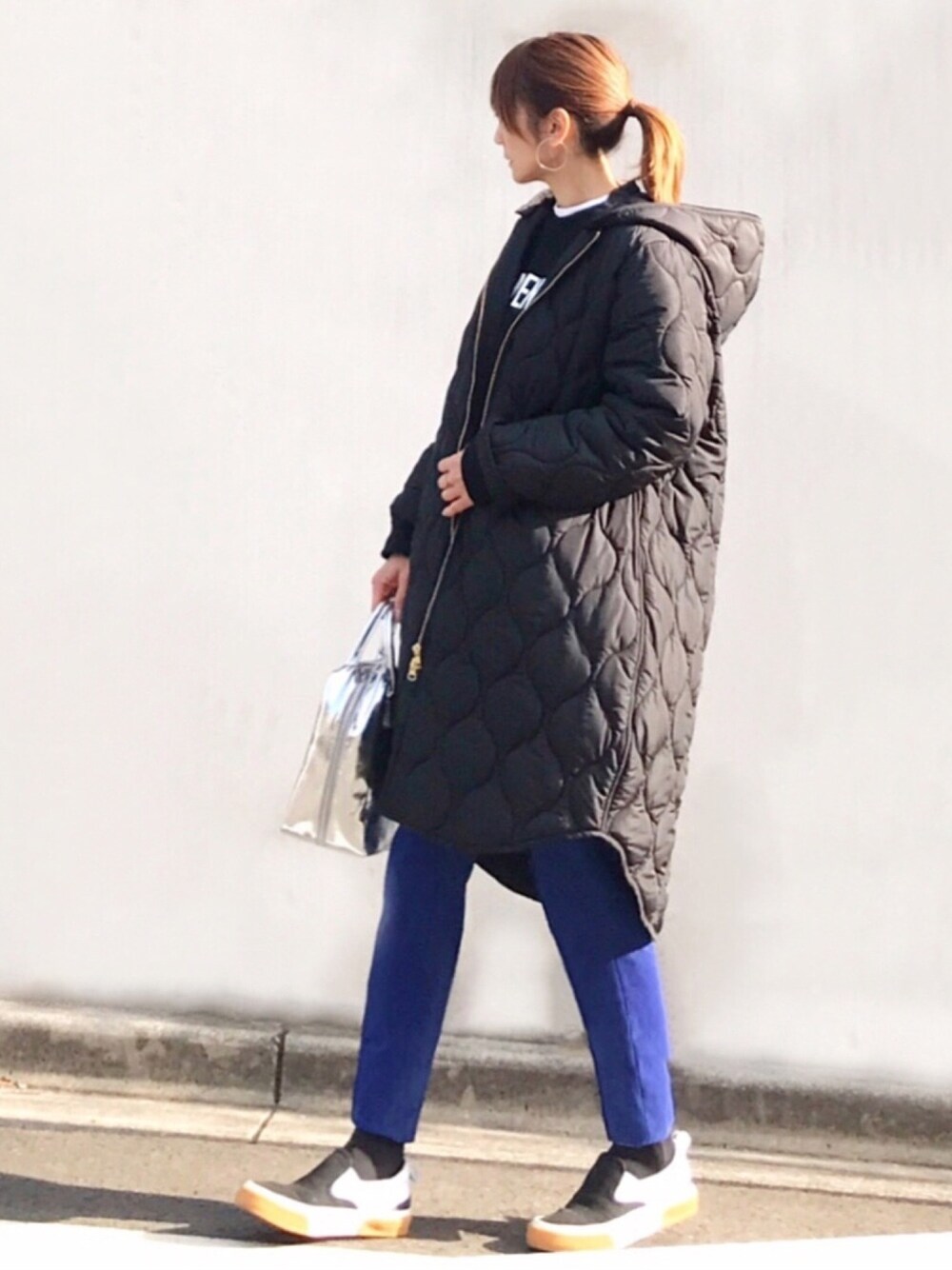 カラーパンツ×ロゴスウェット 発色良いテーパードパンツは大人カジュアルの味方❤︎ロゴスウェットとシルバーbagで遊びつつ、黒多目で落ち着かせて◎