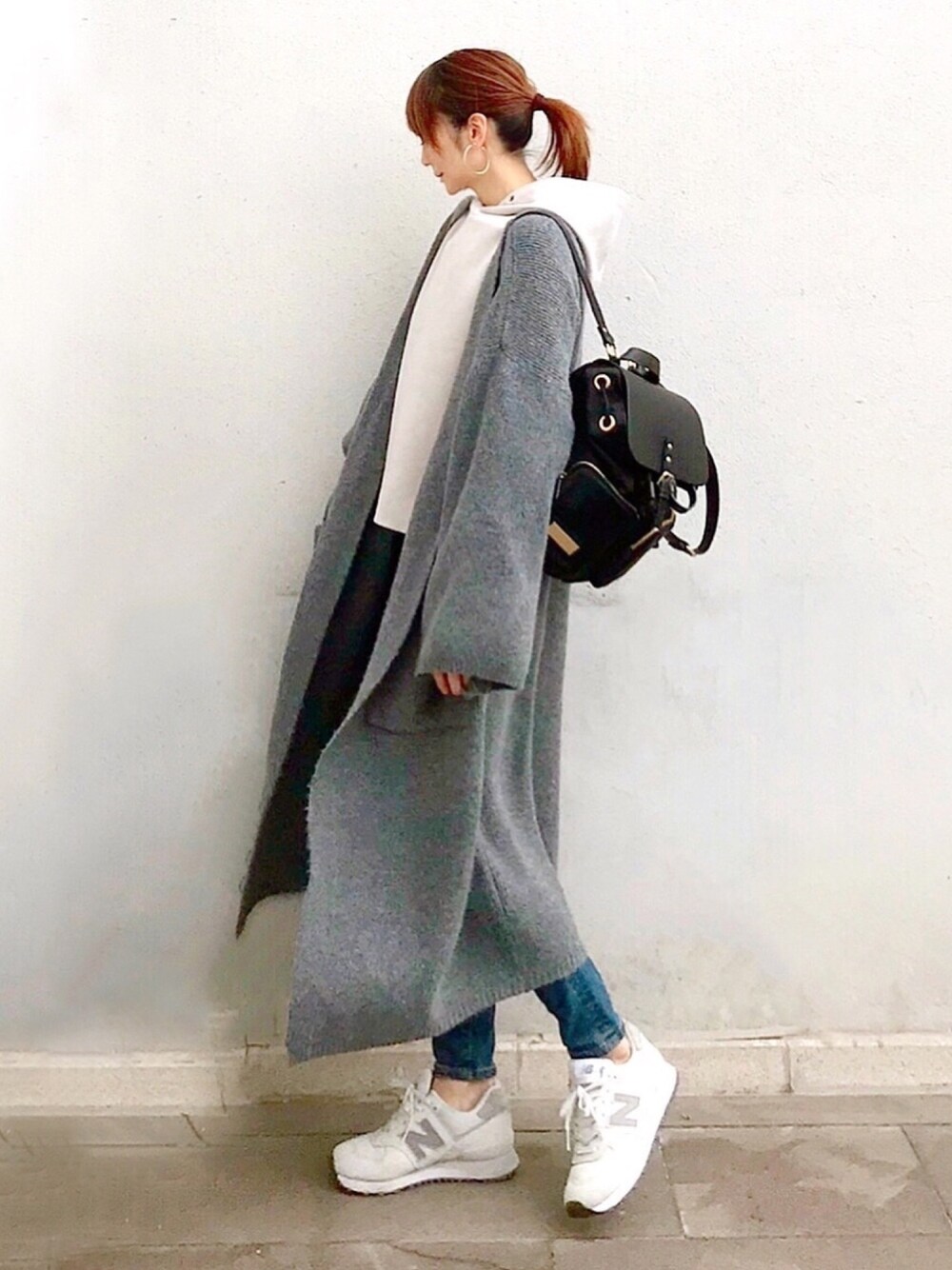 パーカー×ロングカーディガン カバンはバックパックなら動き易い◎