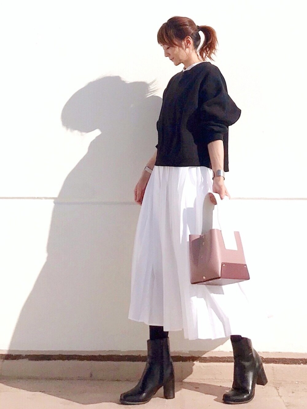 春のモノトーンスタイル プリーツスカートが可愛いワンピースは、トップスを変えて色々着まわせるお気に入りの一着です◎