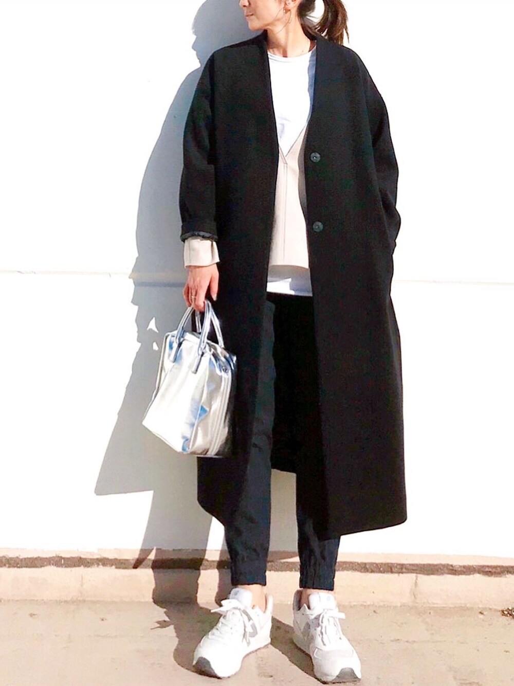 まだ風が寒い日はこんなコーデしてます スニーカーとトップスを白に。カバンをシルバーにすると軽さが出て少し春ぽくなるかな◎