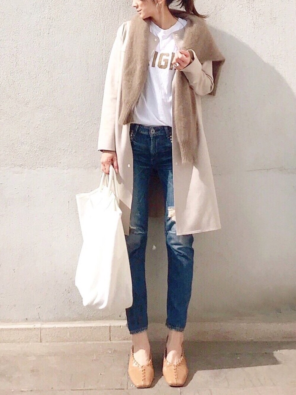 肩掛けカーディガンがやりたくて デニムとベージュの組み合わせって可愛いですよね