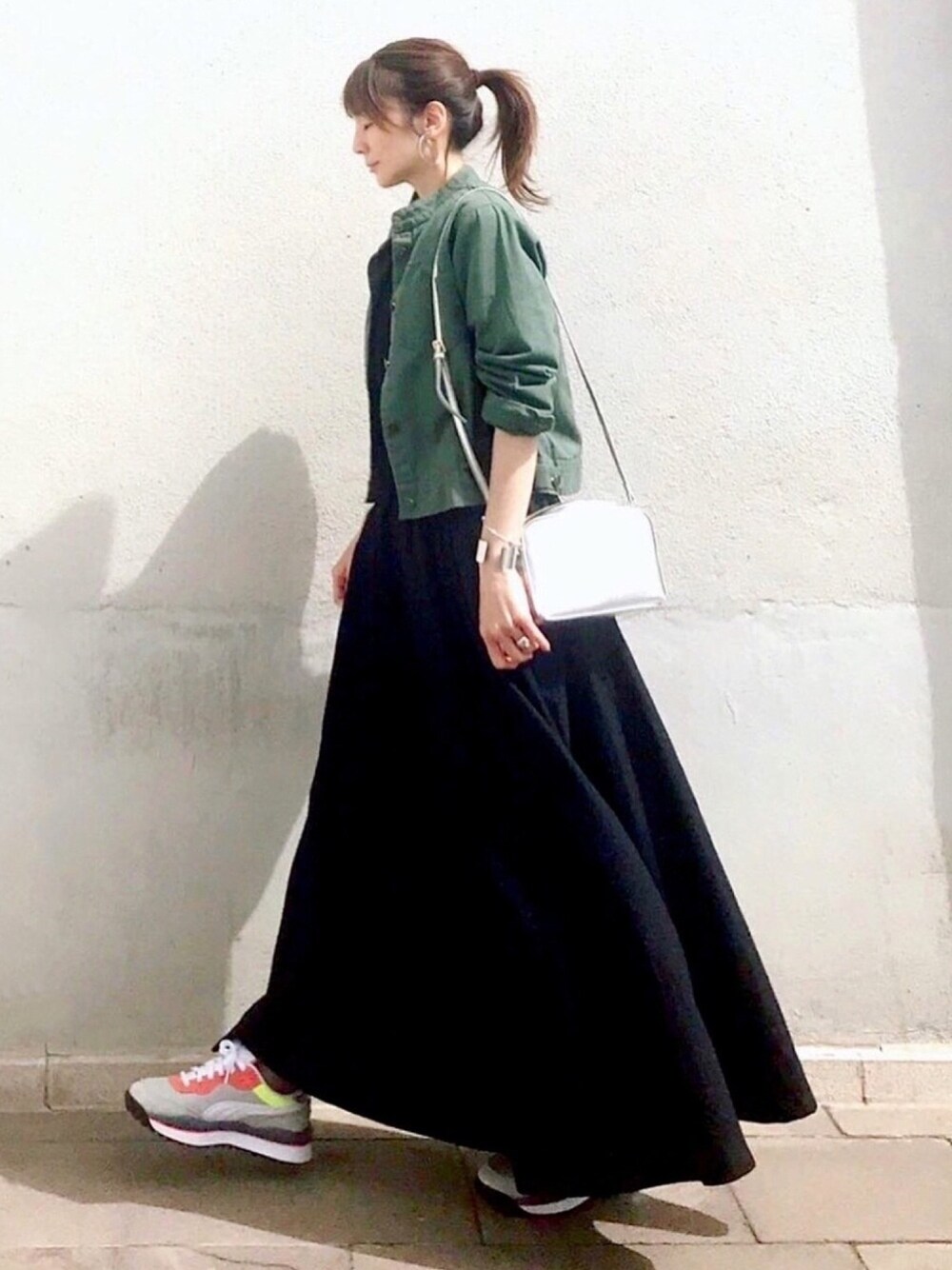 ミリタリーJK × 黒ワンピース シルバーバッグとカラフルスニーカーで軽めに◎