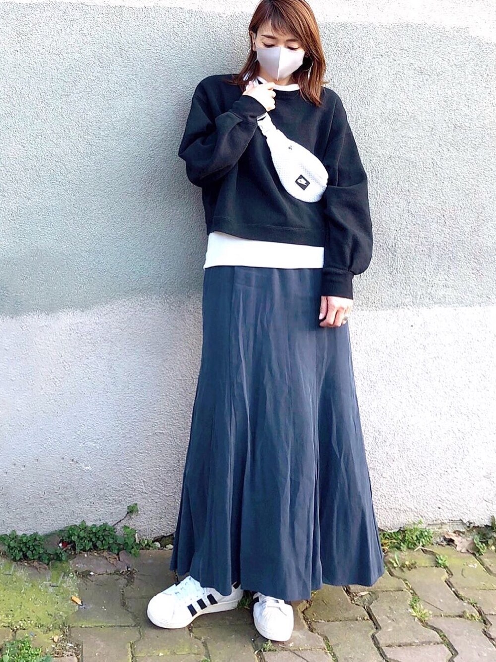 大好きモノトーンカジュアル こちらのスカート 、マキシ丈だけど絶妙なマーメイドシルエットだから、スタイル良く見えるよ◎