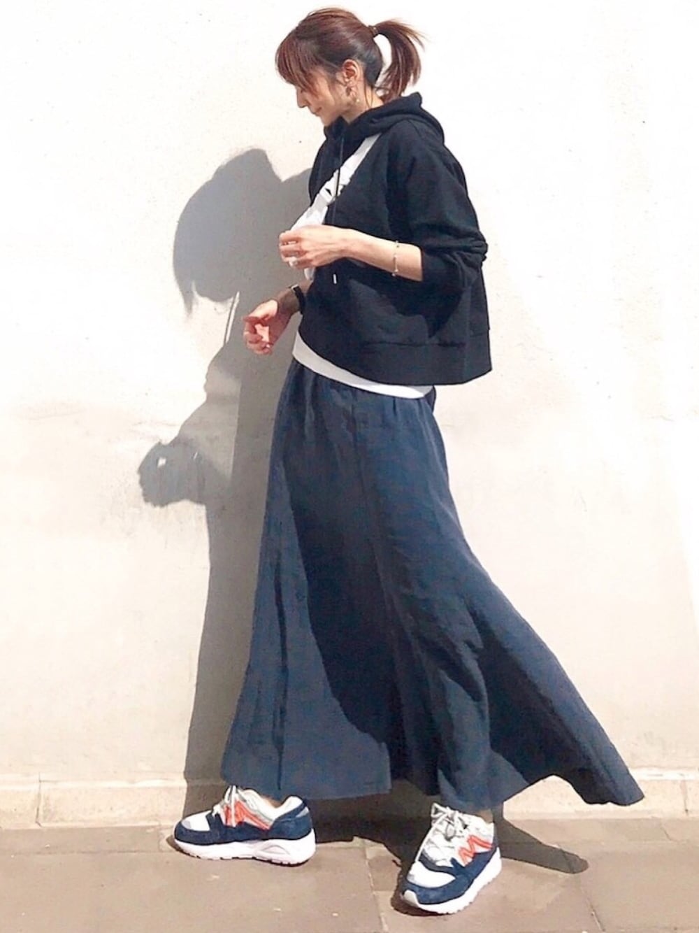 パーカー × マキシスカート このスカートが合わせ易過ぎて、最近こればっかり履いてます!