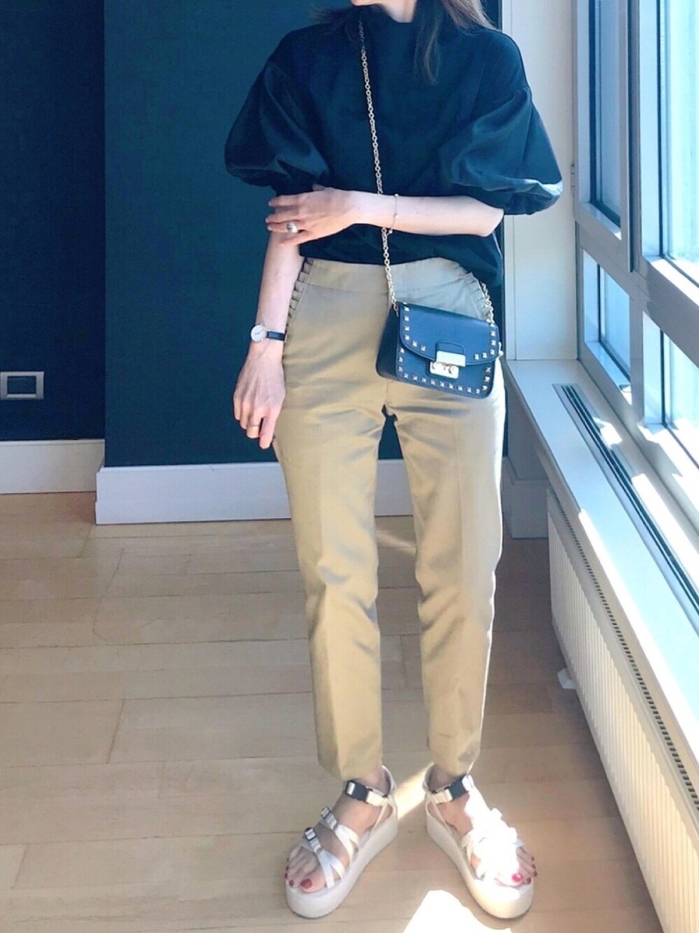 黒×ベージュ 安定の色合わせ。ボリューム袖トップスがシンプルコーデを華やかにしてくれます◎