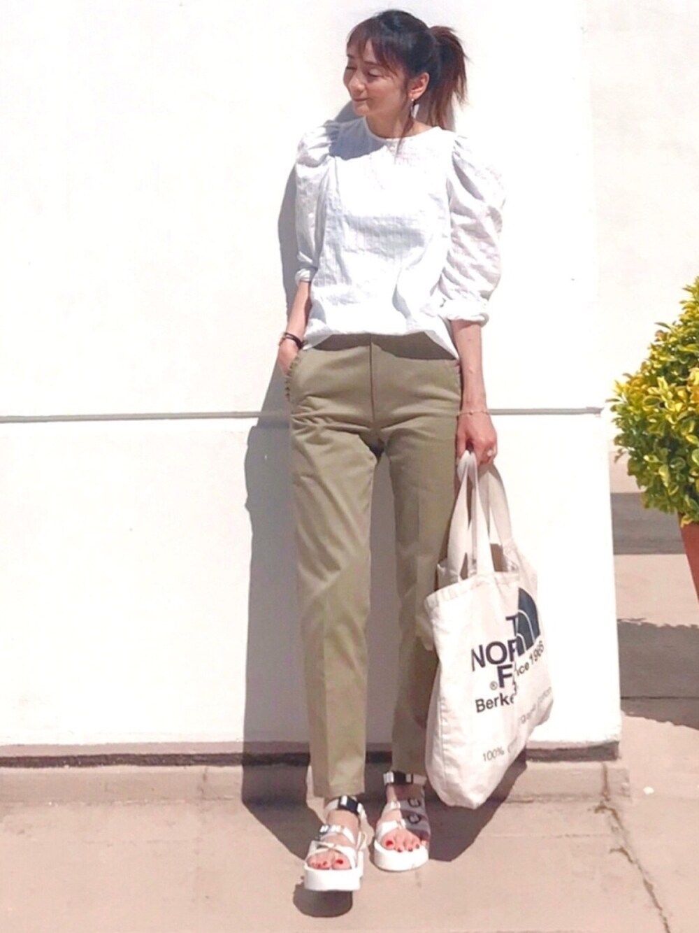 白×ベージュ めちゃくちゃシンプルな合わせだけど、ブラウスが可愛いからお出掛けコーデになります◎