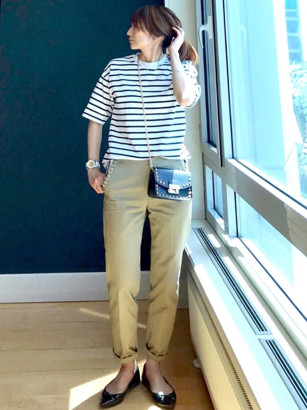 ボーダー × チノパン 定番コーデ。ボーダーの形がゆる目なのがお気に入り◎