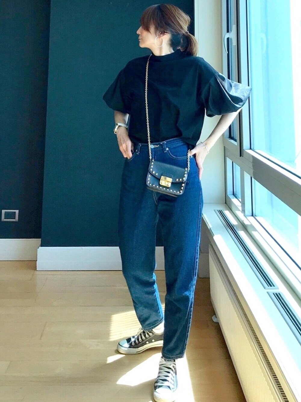 シンプルデニムコーデ トップスに一癖あるから、後はシンプルで充分◎