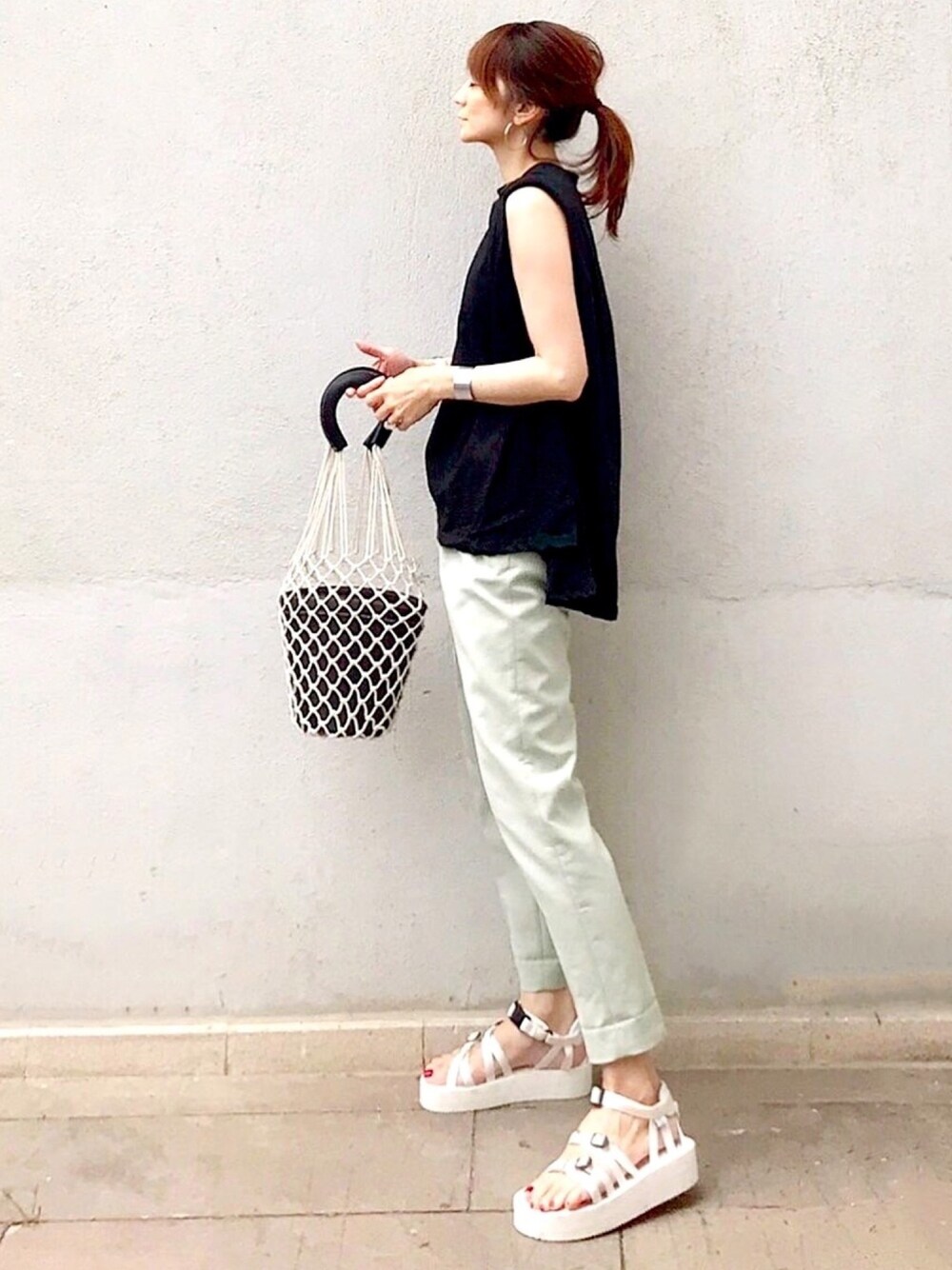 夏コーデ シンプルコーデの時、トップスのパワーショルダーがポイントになります◎