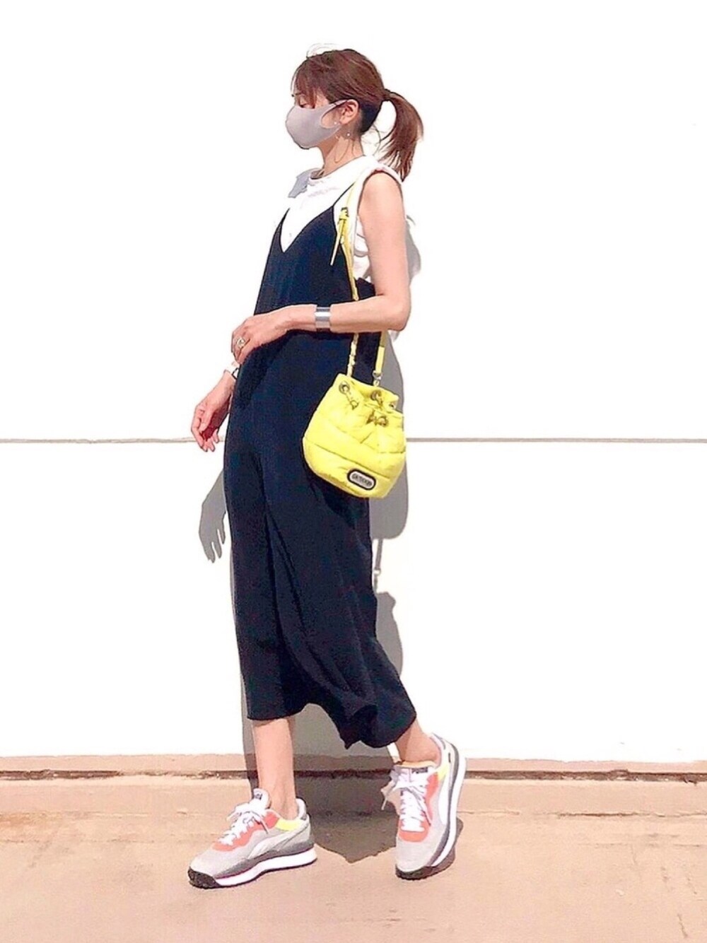 パワーショルダートップスをサロペットに合わせて。 ほんのちょっとの違いだけど、普通のノースリーブよりポイントになります◎