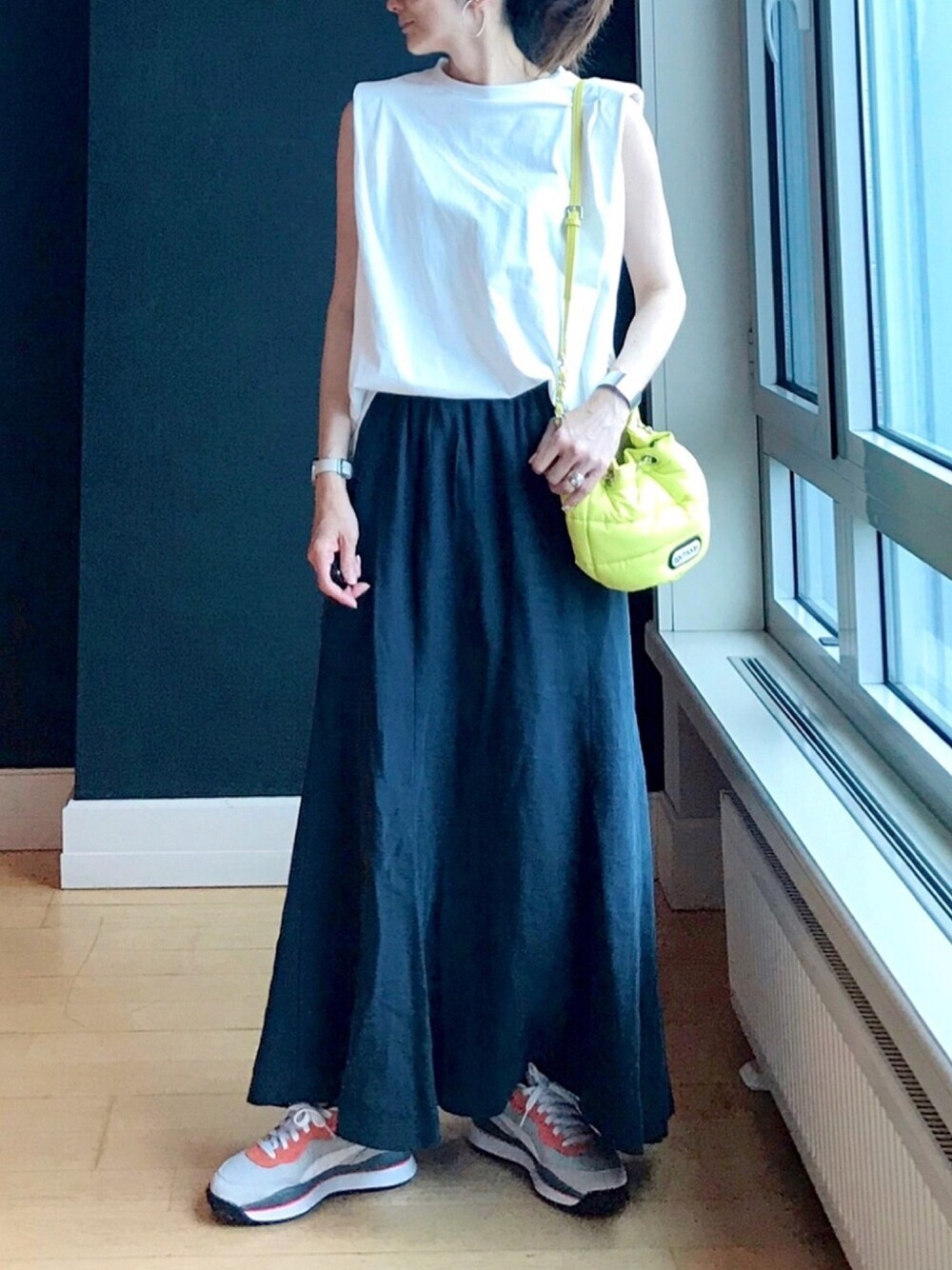 ノースリーブ × ナロースカート スカートがマキシ丈でも、Iラインシルエットにまとめるとすっきり見え◎