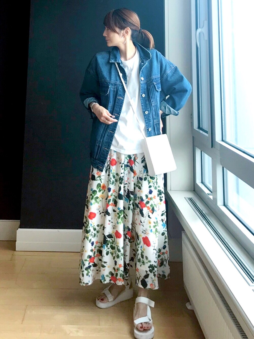 大好きボタニカル柄スカート オールホワイトでまとめてGジャン合わせてみたよ◎