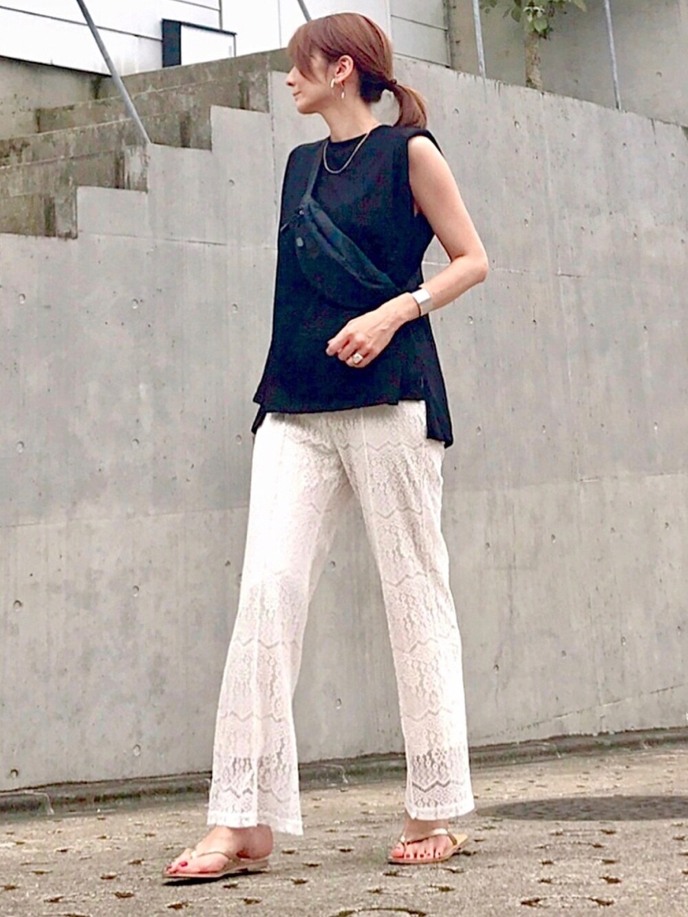 モノトーンカジュアル いつものスタイルも、レースパンツ投入で新鮮◎