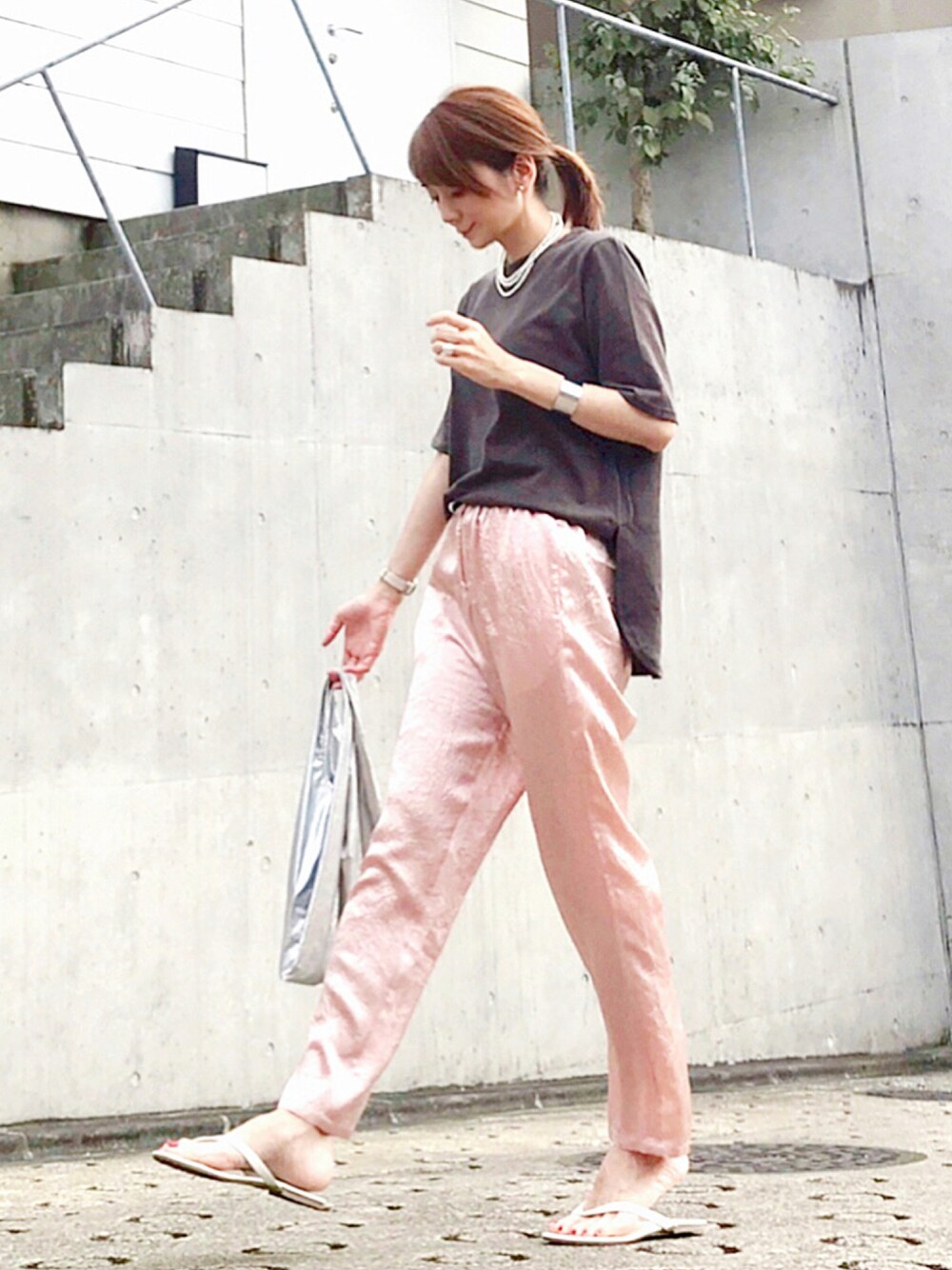 Tシャツにサテンパンツ 楽ちんコーデの時は、光り物多めでお出掛け仕様に◎ Tシャツはしっかり生地だから、身体のラインを拾いにくいです◎ カラーパンツに合う渋いグレーがお気に入り◎