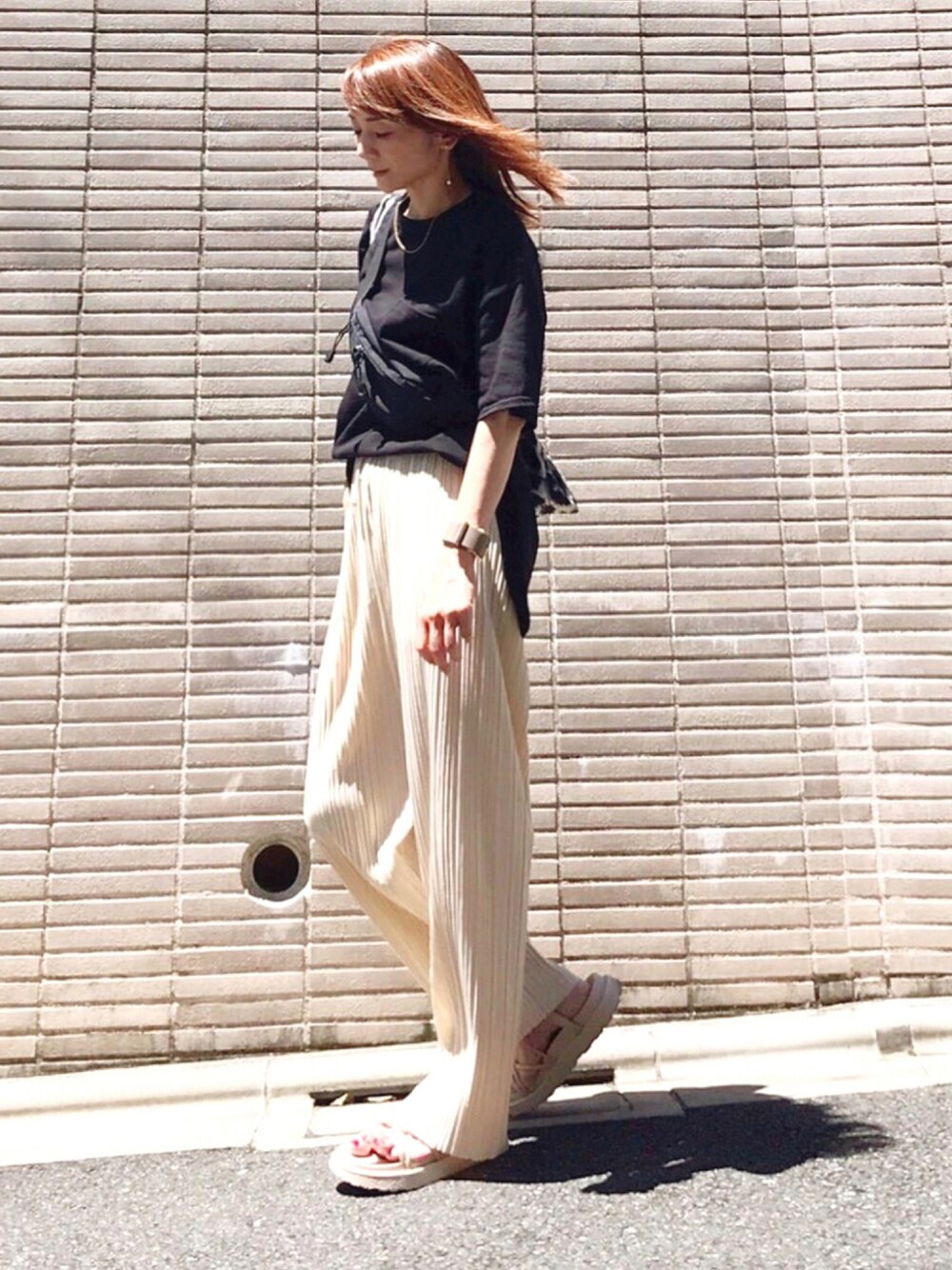 プリーツパンツに黒Tで、超楽ちんカジュアル ベージュスポサンが、白でもない黒でもない優しい感じで良いです◎