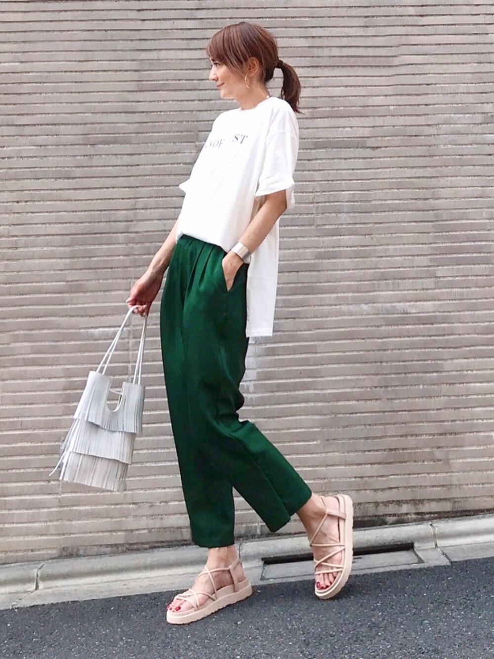 白Tシャツコーデ 足元は白か迷ったけど、ベージュスポサンが絶妙に馴染みました◎ Tシャツは程よくゆとりあるサイズ感と袖のロールアップがポイントです◎