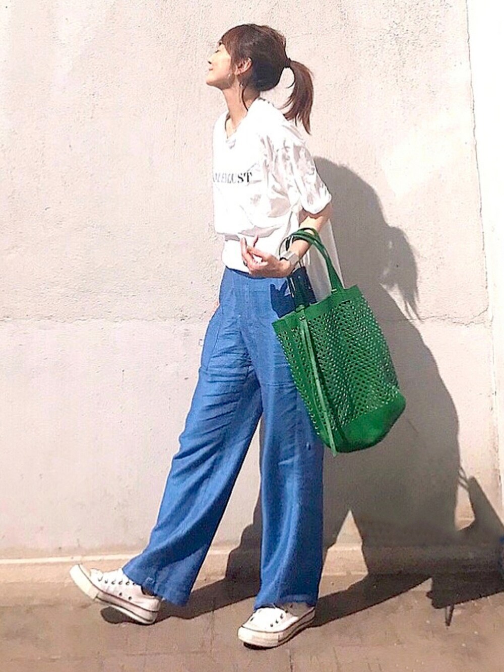 Tシャツコーデ シンプルだけどロゴとカバンの緑で良い感じ◎