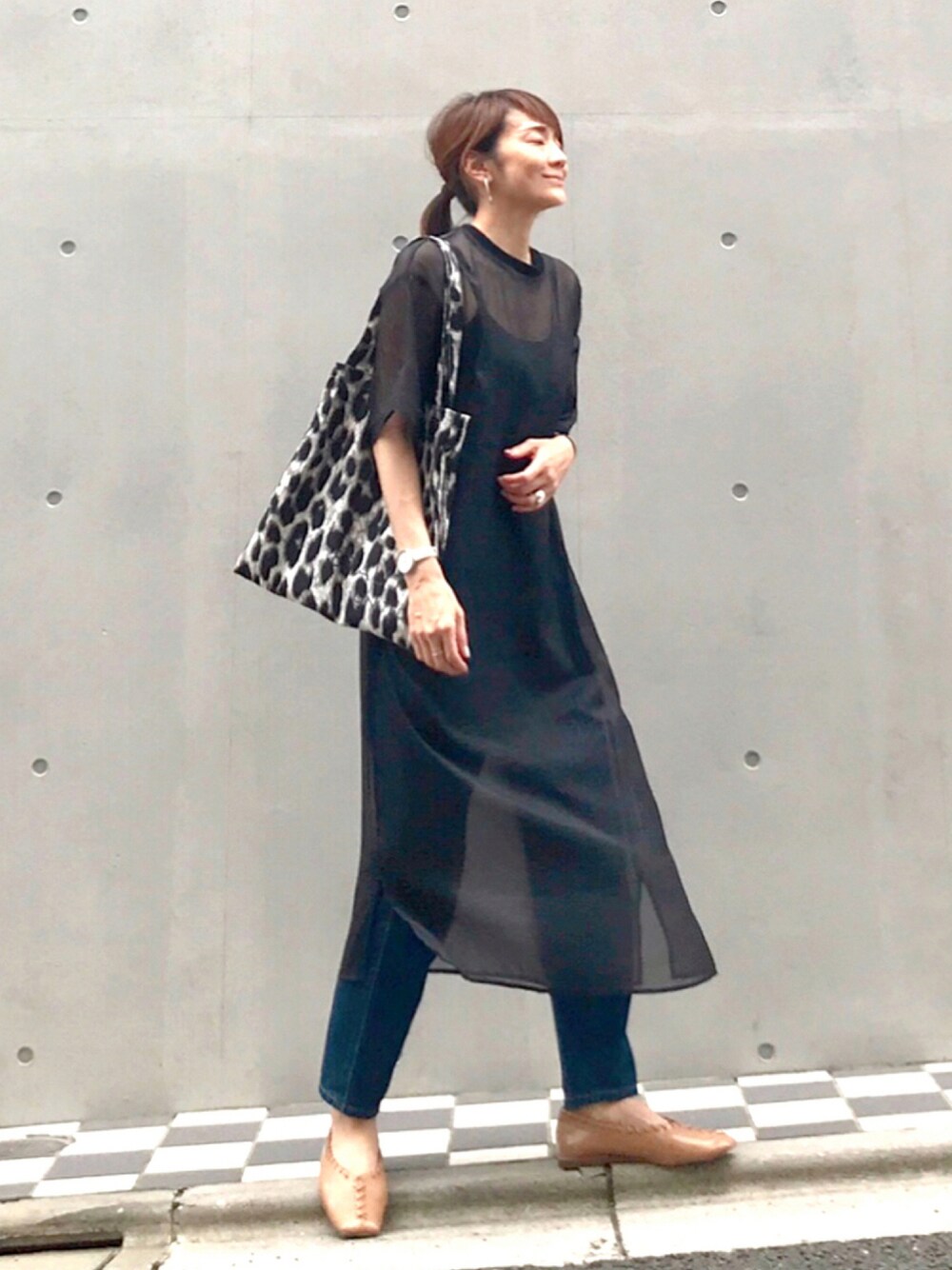 シースルーワンピース 黒でも重くならないのは、シースルーとリブ使いのお陰◎ 小物で秋感🍁出してます