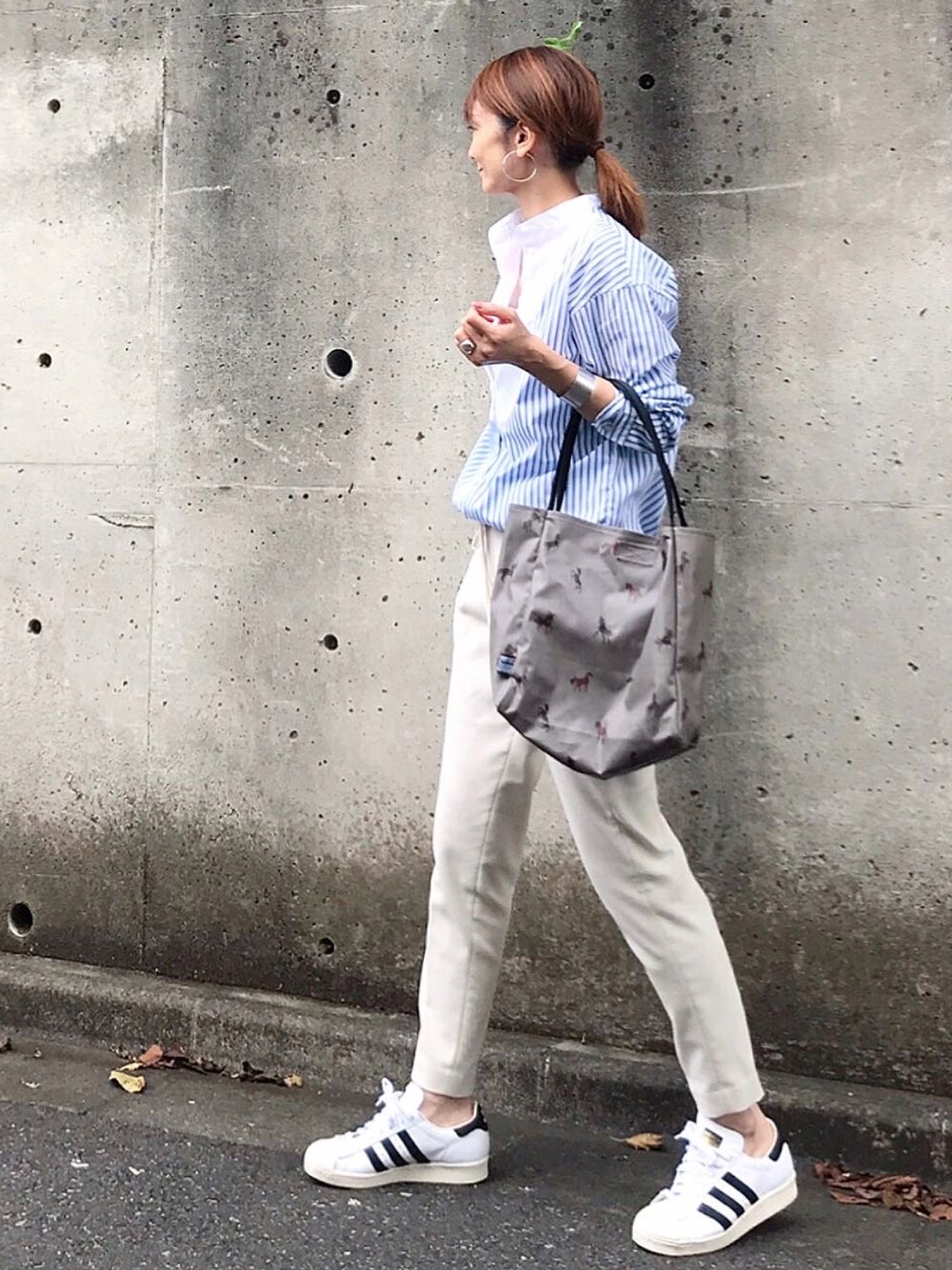 大人カジュアル ストライプシャツに、馬柄トートの柄×柄のコーデ◎ 柄トートは、目立ち過ぎないから大人カジュアルに馴染みます◎