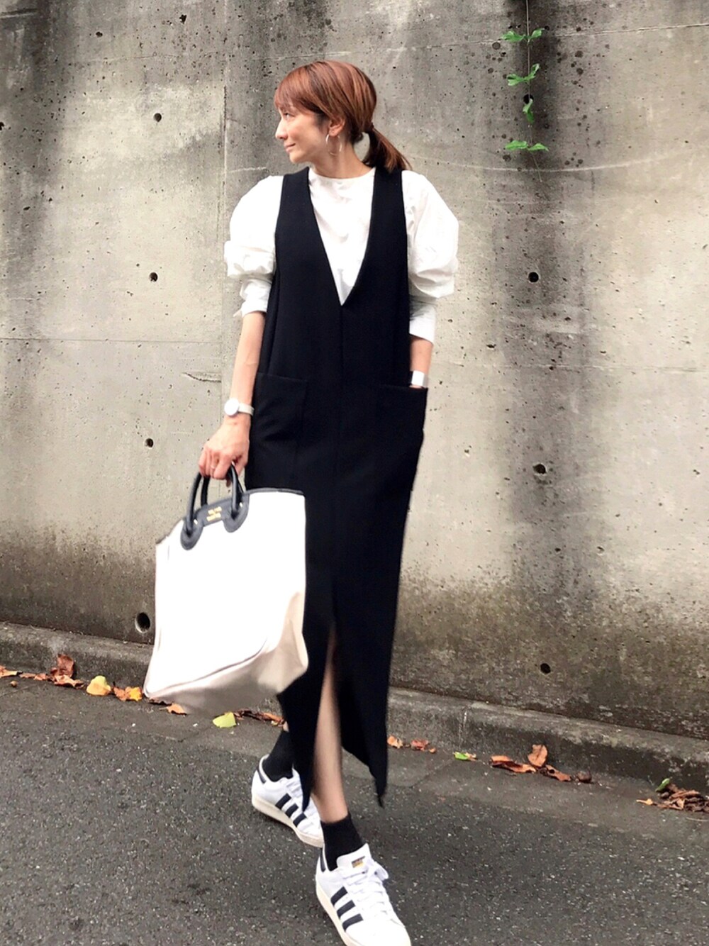 可愛げのあるモノトーンカジュアル インに合わせたボリューム袖ブラウスがポイントです◎ モノトーンでもどことなく甘さが欲しい方にはオススメです◎