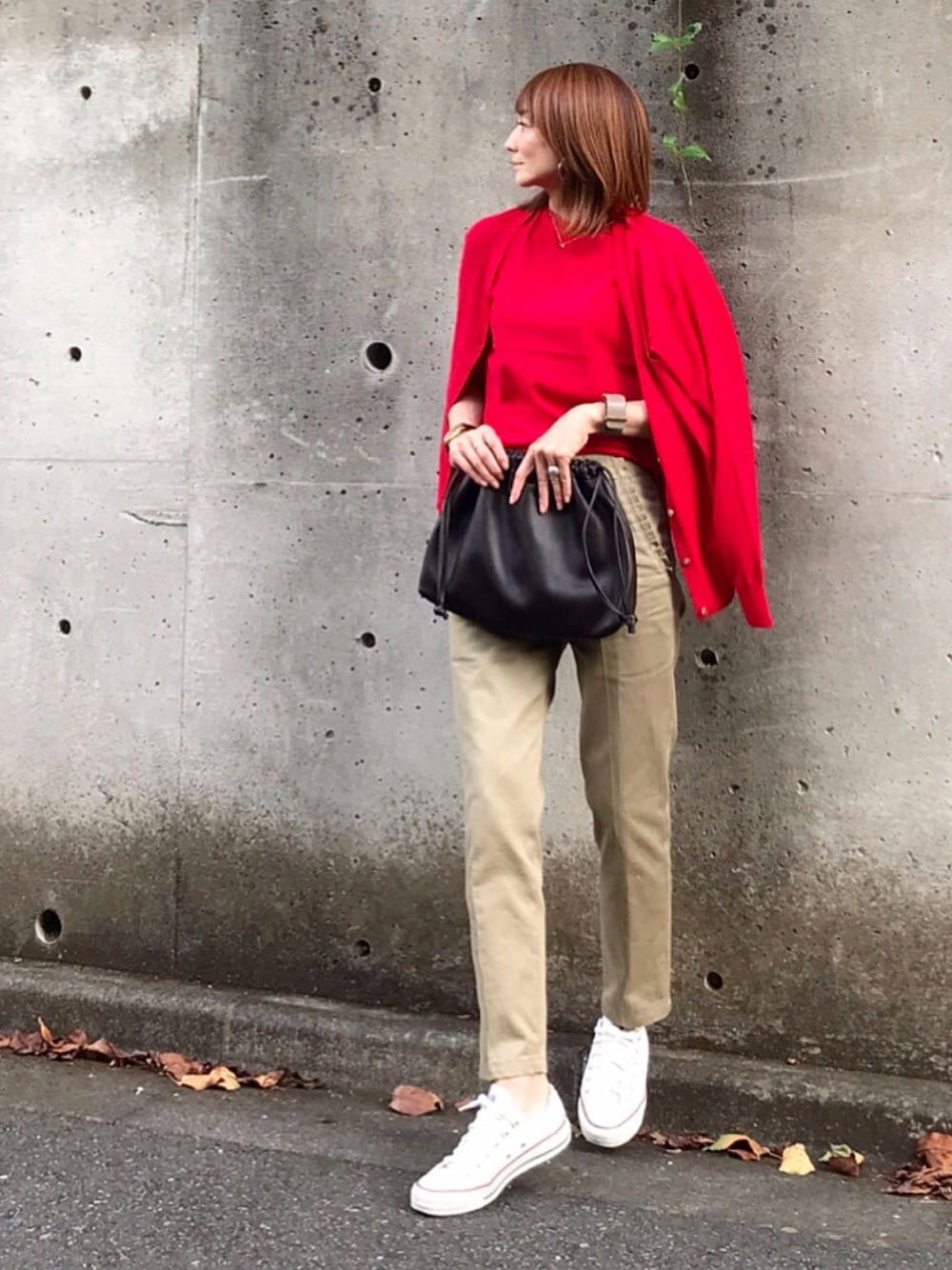 赤×チノベージュ めちゃくちゃ好きな組み合わせ◎ニットはアンサンブルだから、秋に大活躍! 赤が得意じゃない私でも、しっくり◎ピュアレッドの色が本当に良いです。