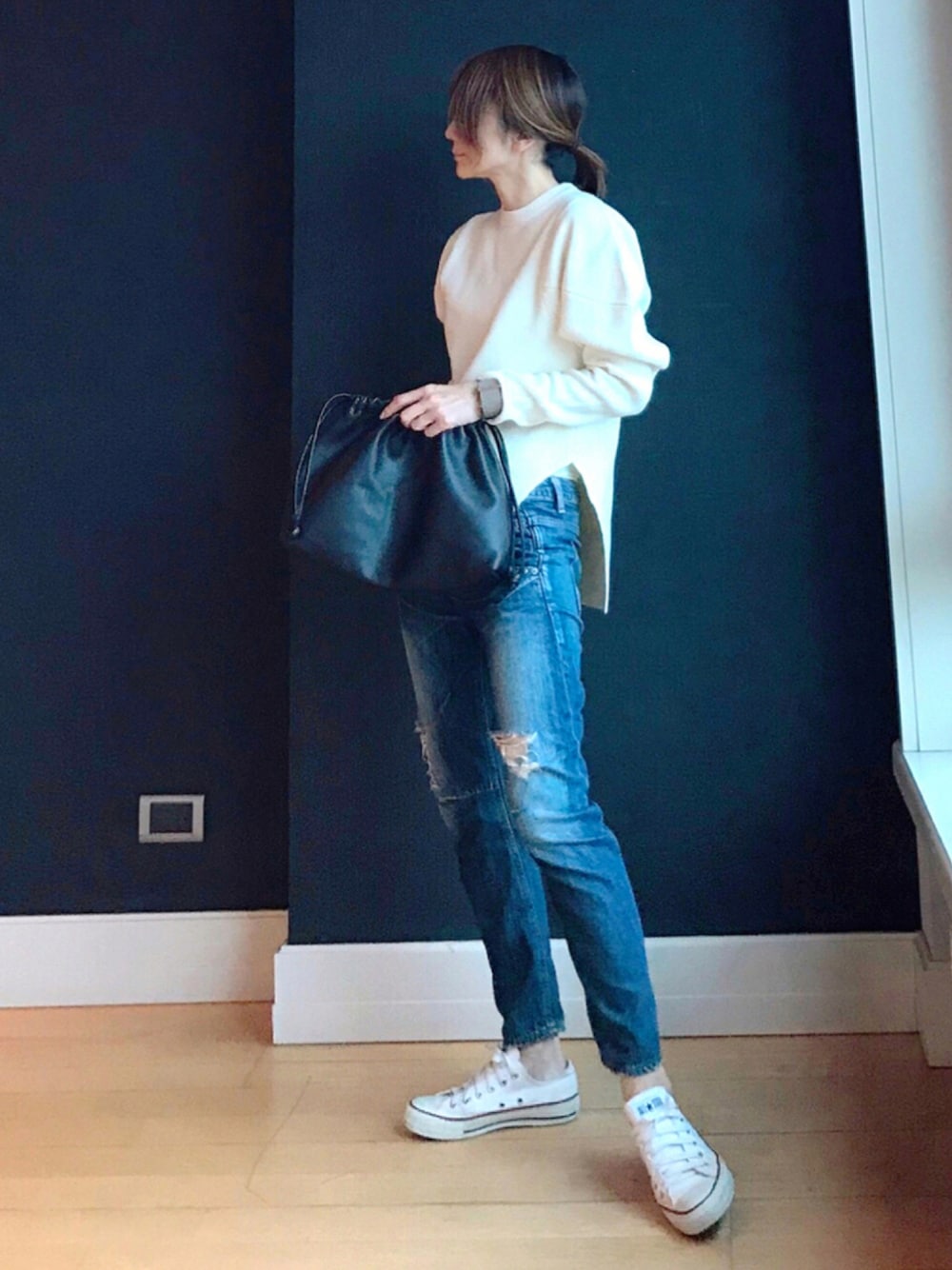 maison special のコクーンショルダーニット 一癖あるヘムデザインとコクーンショルダーが、シンプルデニムコーデを新鮮に見せてくれます◎
