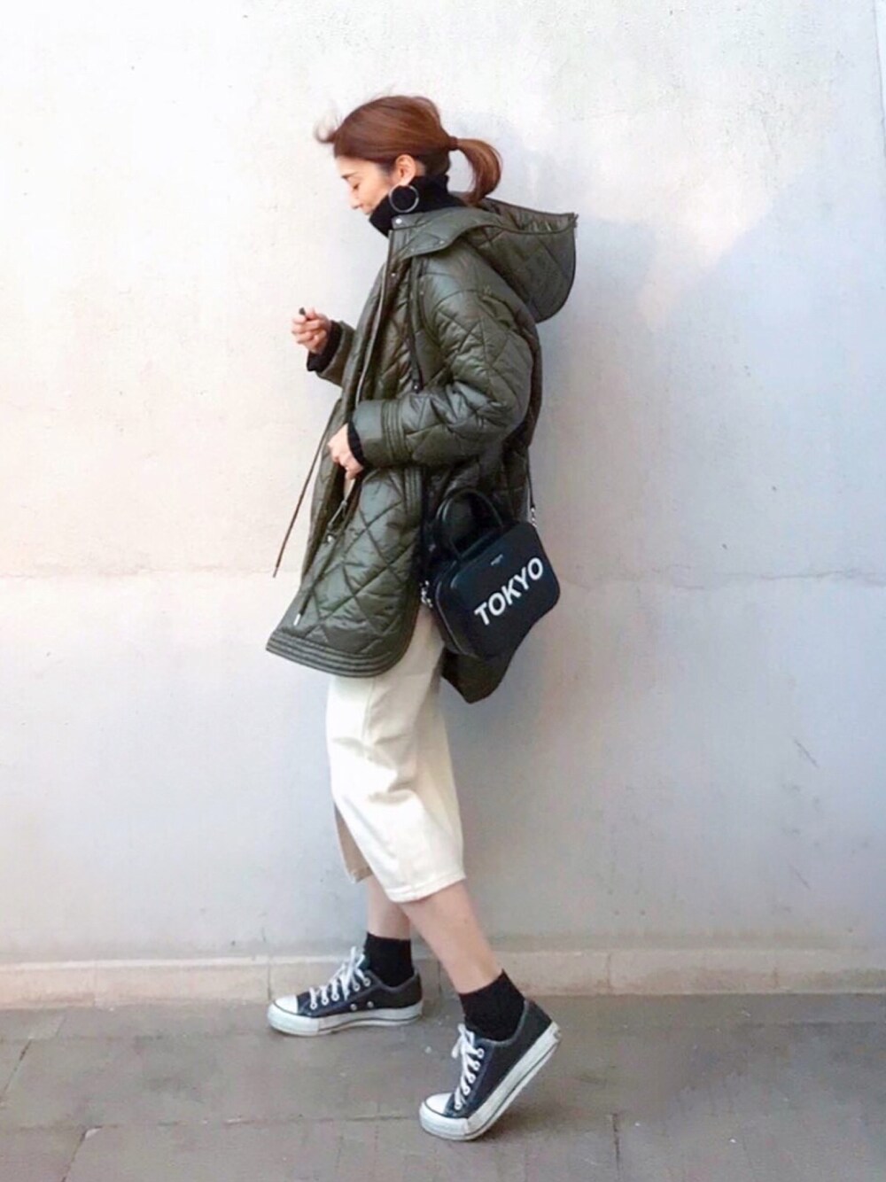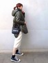 カーキアウターお気に入り 白スカートで抜け感を◎スリット入りで歩きやすいです。