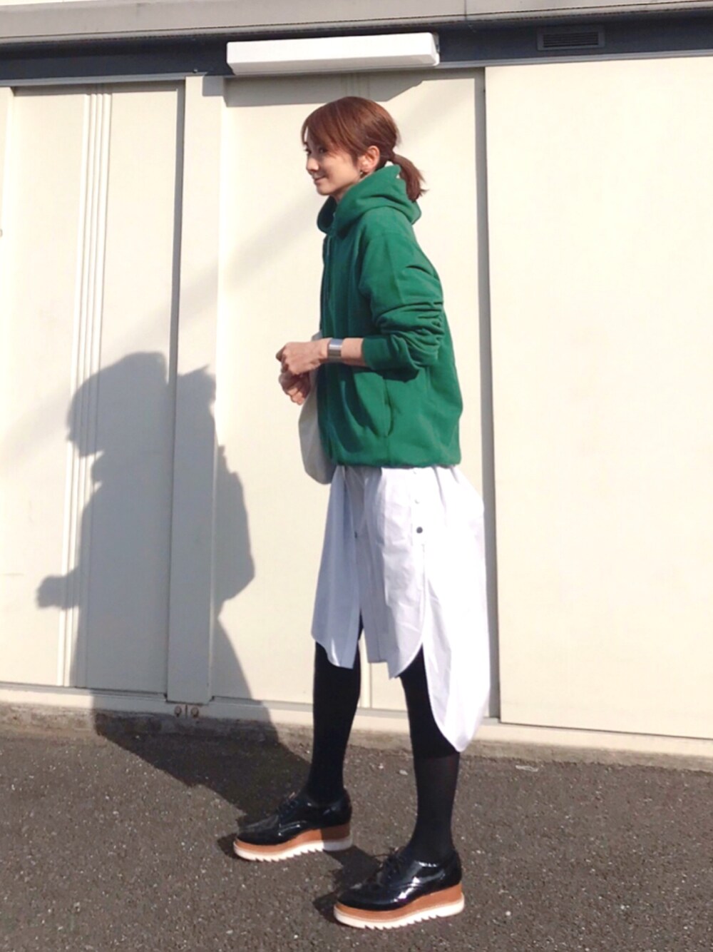 シャツワンピ×パーカー A + tokyo のシャツワンピは、裾に前後差があるデザイン。動きがあって凄く可愛いです◎
