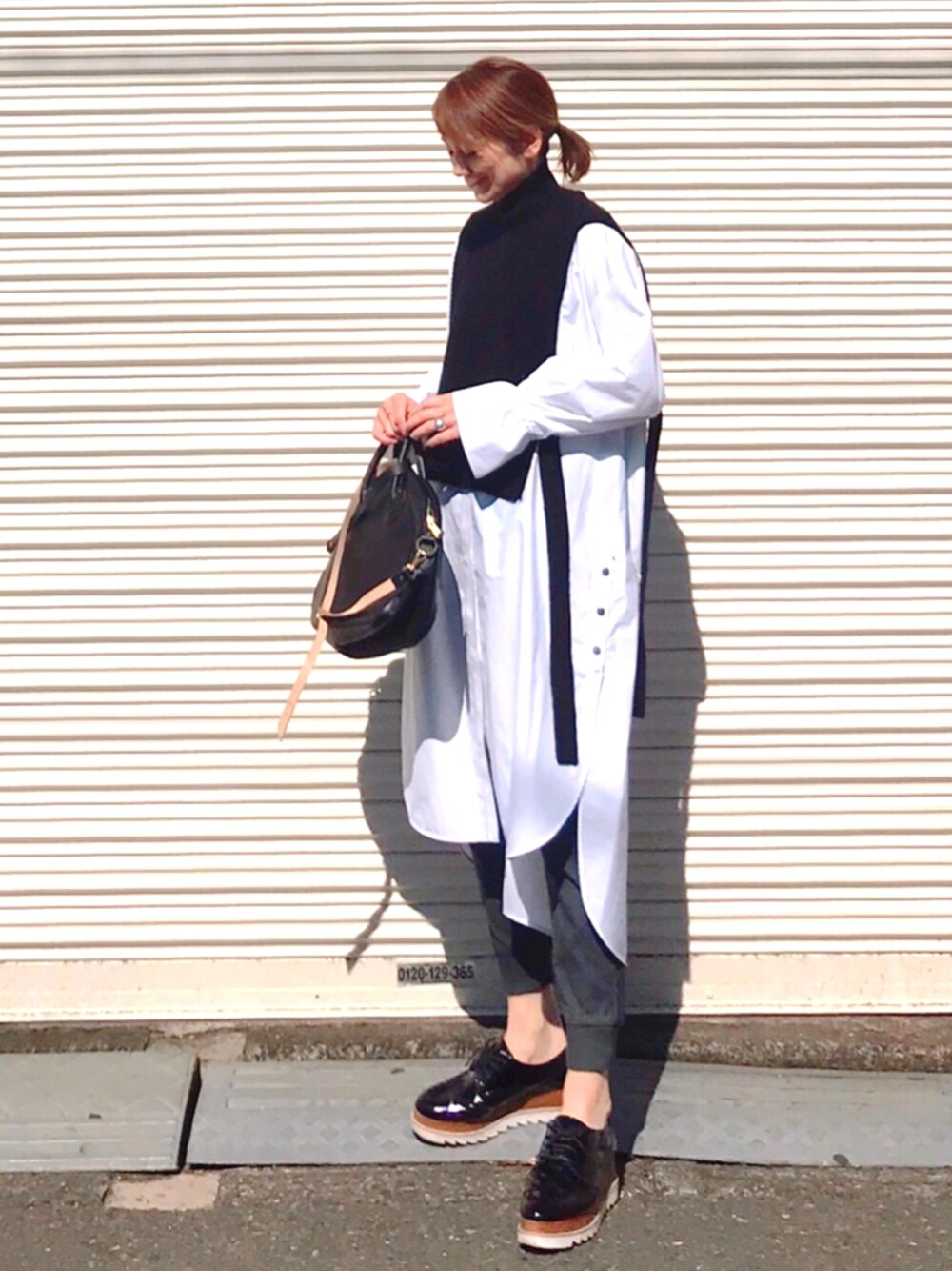 シャツワンピ×ビブベスト ビブベストはコーデのイメージが変えられるし、重心が高くなるからスタイルアップ⤴️